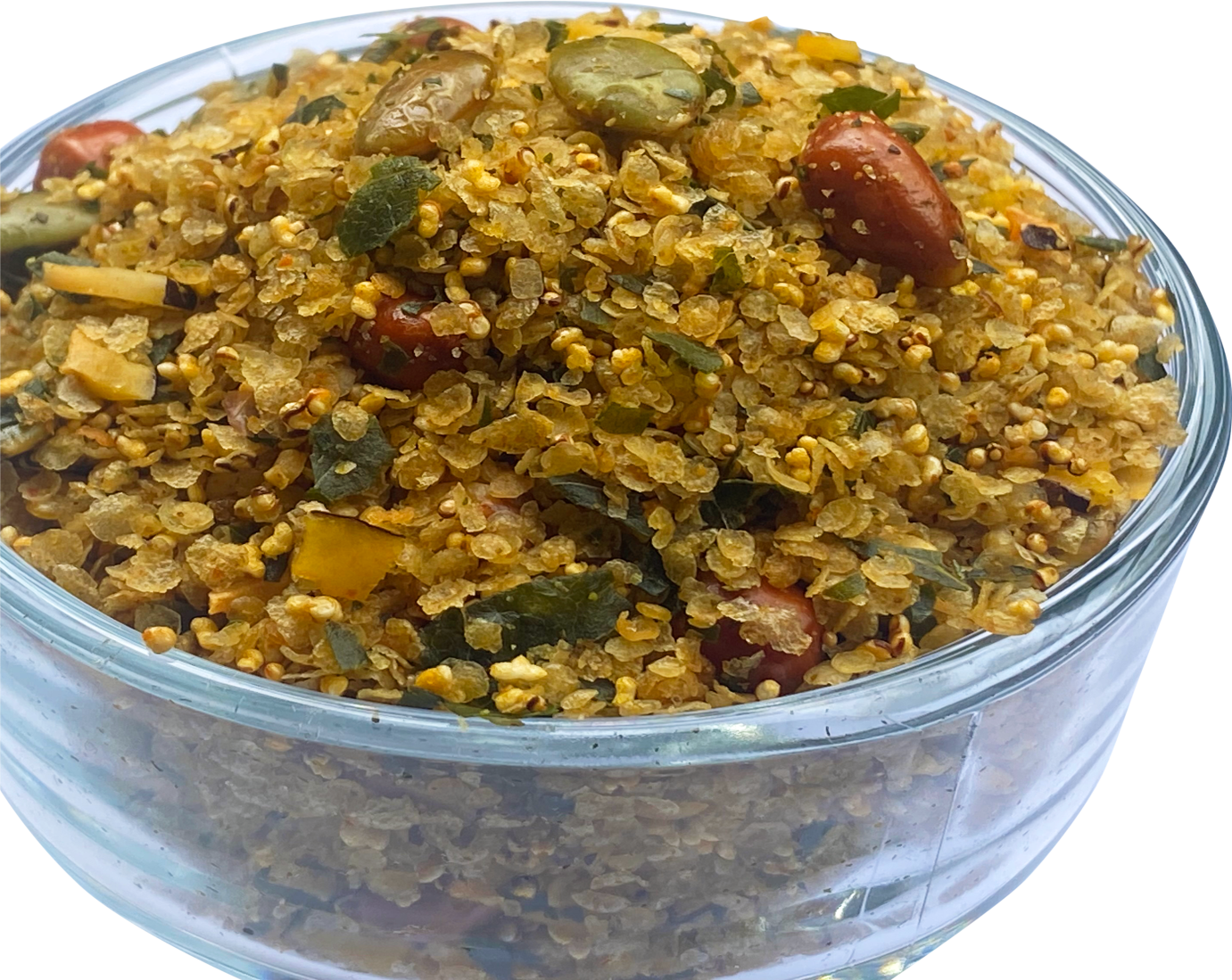 The flakes of millets are lightly roasted with small quantity of bull driven coconut oil and seasoned with superfood seeds, peanuts, roasted channa, curry leaves, salt and chillies.
